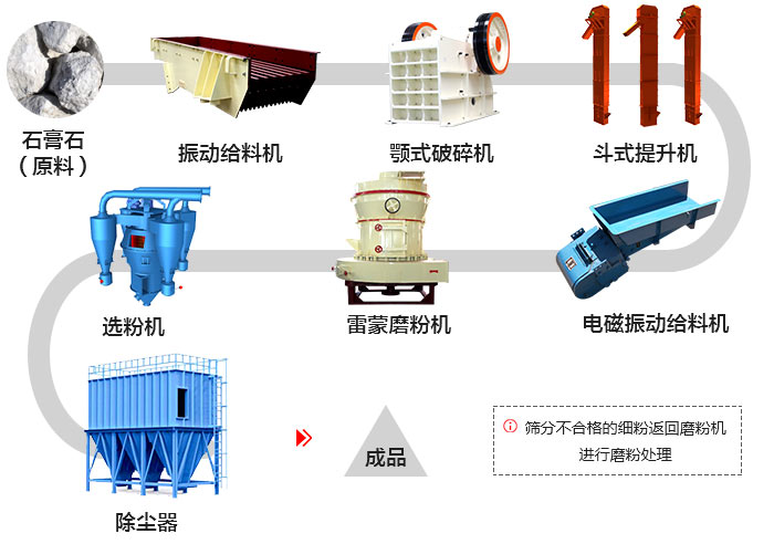 磨粉是提高石膏石綜合利用率的有效途徑,經磨粉后的石膏石綜合利用率高,其磨粉生產線工藝流程大致為: